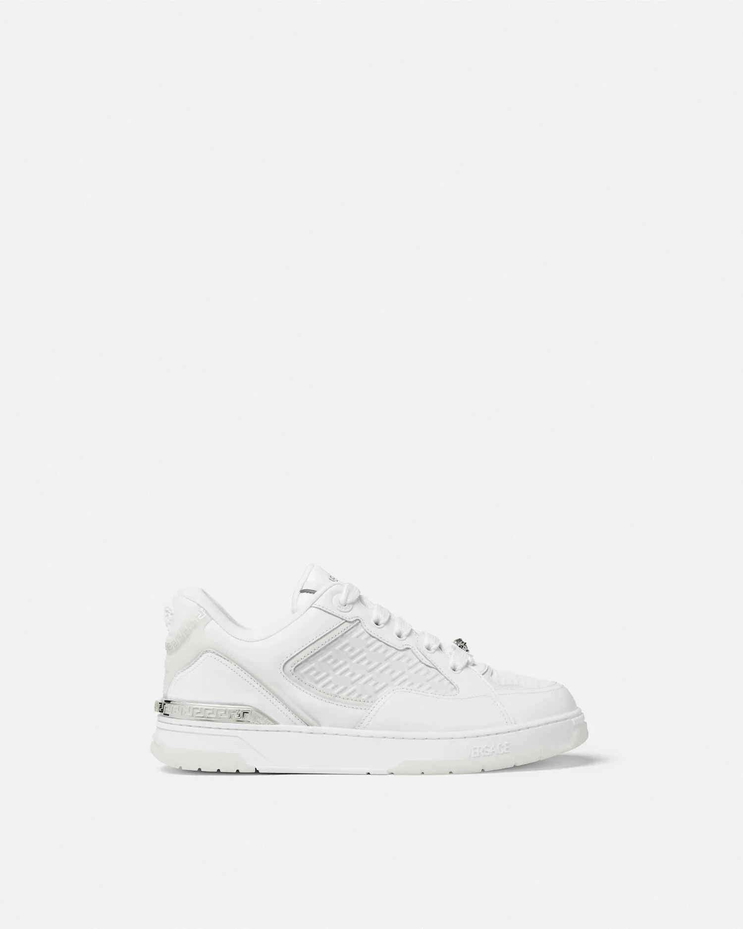 Biggie Basket offers an off-court, basketball-inspired design, characterized by signature House codes including the Medusa Biggie emblem on the laces. The low-top style provides ankle support with mesh padding on the collar and tongue. Distinctive Greca motifs are created through high-frequency leather, hand-painted patterns on the heel counter and are engraved on metal hardware. The pair comes with two lace options in different widths. - Medusa Biggie hardware - Medusa hardware - Versace Logo motif - Greca motif - Low top - Round toe - Laces 2-set - Outer composition: 100% Calf leather - Lining: 100% Polyester - Trim: 100% Calf leather - Sole: 100% Rubber Size & Fit - The shoe weighs approximately 21.2 oz / 0.6 kg for the model size 39 IT - Footbed: comfortable - Fits true to size, take your normal size Item: 1020593-1A14615_2WY4P