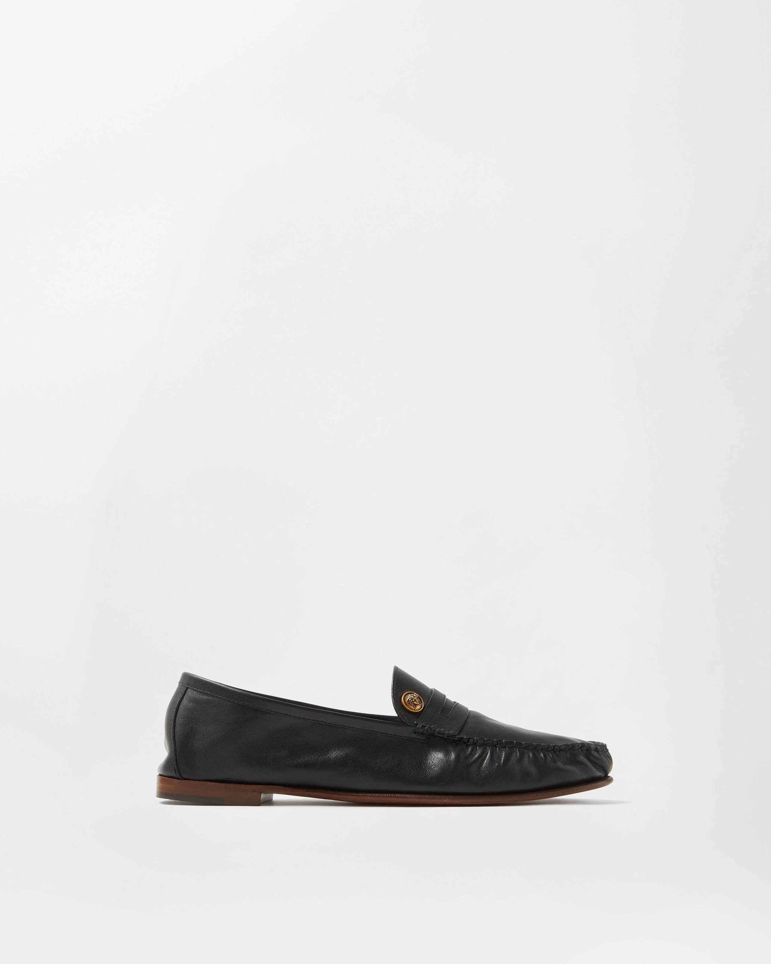 The Guanto leather loafers are crafted in an unlined construction from supple vegetable-tanned calf leather. The leather develops a natural patina, offering a soft hand feel, and is hand-treated with a washing or buffing process to achieve a vintage texture. This pair is accented by 3D Medusa hardware and is set on an ultra-soft leather sole, providing supreme lightness and flexible movement. - Medusa hardware - Slip on - Round toe - Penny strap - Elastic - Outer composition: 100% Calf leather - Lining: 100% Goat leather - Sole: 100% Calf leather Size & Fit - Fit is true to size, we recommend taking your normal size - Footbed: Comfortable Item: 1023322-1A17346_1B55J