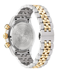 The Hellenyium Chrono watch takes inspiration from the original Hellenyium line. This sporty timepiece is embellished with Medusa and Greca accents. The watch features chronograph movement with three counters and it's finished with metal band. DETAILS & CARE - Case: IP Champagne round case with tachymeter scale - Silver dial with Versace logo and Medusa at 12h - Bracelet: IP Champagne and Staineless Steel metal band - Movement: VEM927 Swiss quartz Chrono movement - Water Resistant: 5 ATM SIZE & FIT - Case: 1'7" inches