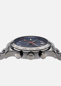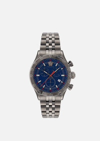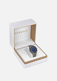 A contemporary reimagination , the Hellenyium Chrono takes inspiration from the original Hellenyium line. This sporty timepiece embellished with an emblematic Medusa and Greca accents. The watch features chronograph movement with three counters on the blue dial. Finished with a gun metal case and wristband. DETAILS & CARE - Case: IP Gun round case with tachymeter scale - Dial: Blue dial with Versace logo and Medusa head at 12h - Bracelet: IP Gun band with buckle with pushers - Movement: VEM927 Swiss quartz Chrono movement - Water Resistant: 5 ATM