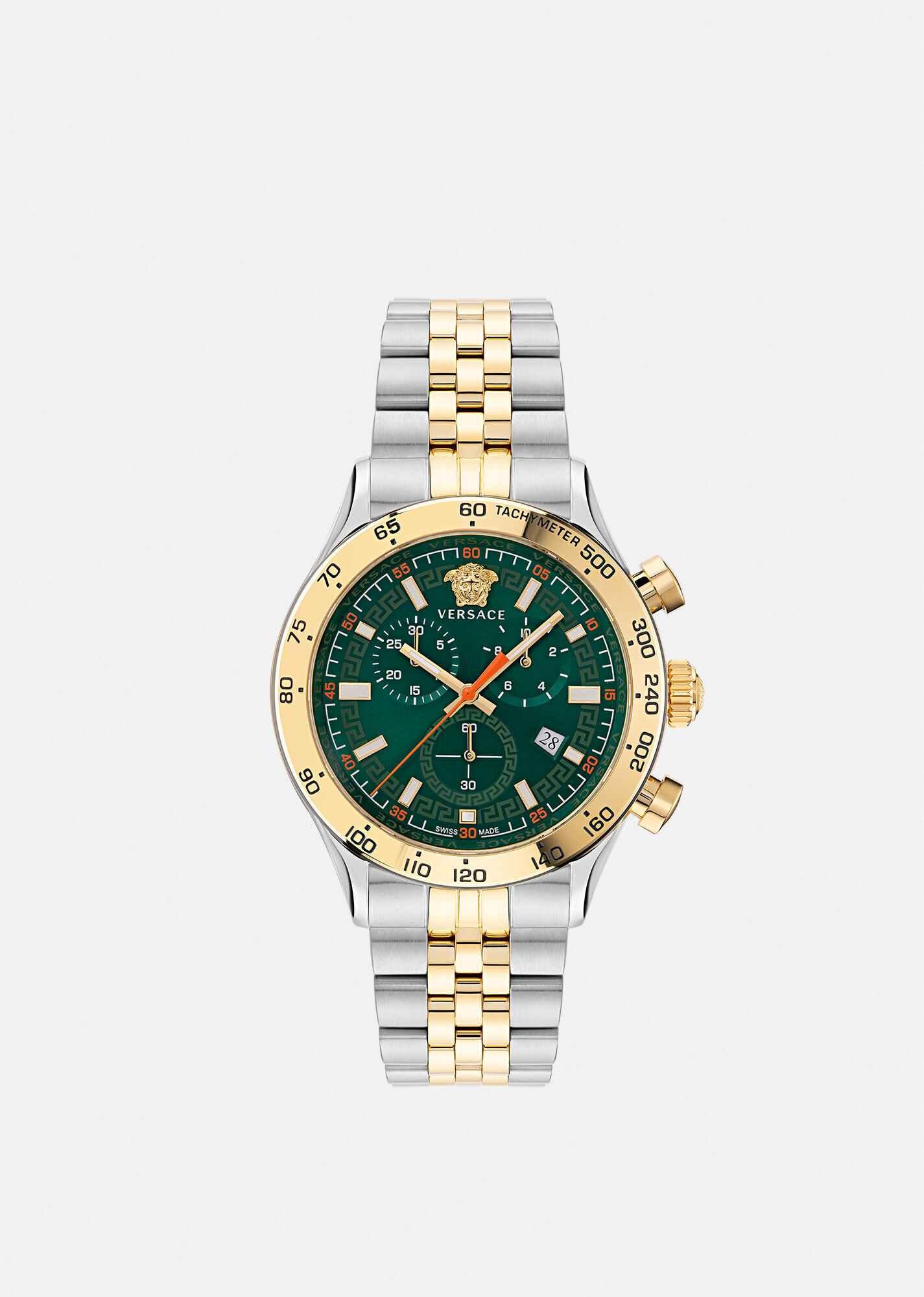 A contemporary reimagination , the Hellenyium Chrono takes inspiration from the original Hellenyium line. This sporty timepiece embellished with an emblematic, gold-tone Medusa and Greca accents. The watch features chronograph movement with three counters on the green dial with a champagne case. Finished with a stainless steel and champagne wristband. DETAILS & CARE - Case: Bico(SS&IP Champagne) round case with tachymeter scale - Dial: Green dial with Versace logo and Medusa head at 12h - Bracelet: Bico(SS&IP Champagne) band with buckle with pushers - Movement: VEM927 Swiss quartz Chrono movement - Water Resistant: 5 ATM