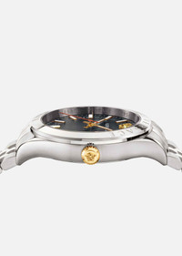 Contemporary and elegant, the new Hellenyium timepiece for men is charactered by clean lines and classic color combinations, featuring a stainless steel metal band and sleek black dial embellished with an emblematic Medusa. DETAILS & CARE - Case: Round, stainless steel, logo on the top ring - Dial: Black, Medusa and logo at 12 o'clock - Bracelet: Stainless steel metal band with butterfly buckle - Movement: Ronda 515.2, Swiss quartz 3 hands - Water resistant: 5 ATM SIZE & FIT - Case: 42 mm
