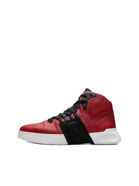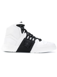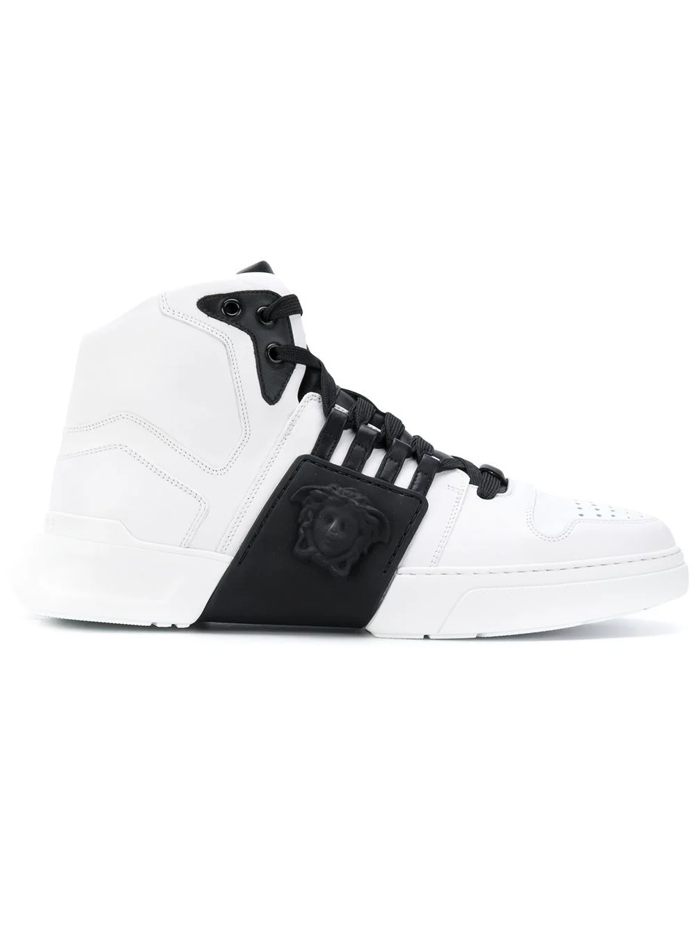 high top sneakers Versace embraces a youthful energy around the collection - with emphasis upon detailing and a bohemian theme. From form-fitting minimalist silhouettes to sleek tailored pieces, the brand has stylish unique pieces for every occasion. White black leather high top sneakers from Versace featuring a lace up detail. Made in Italy Composition Lining: Calf Leather 100% Sole: Rubber 100% Outer: Calf Leather 100% SIZE & FIT Measurement Sole height 1.18 in(3 cm) HEEL 1.57 in(4 cm)