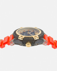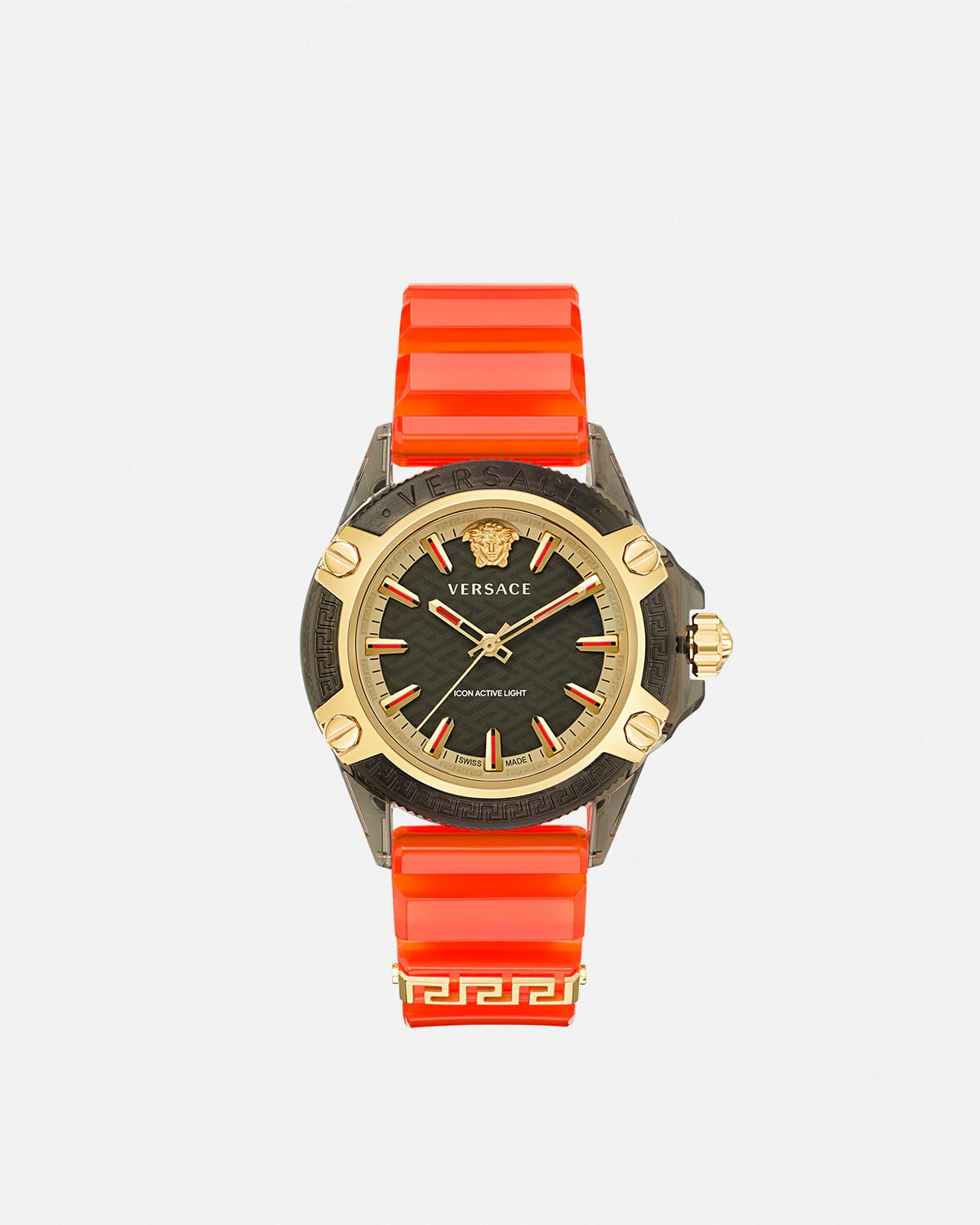 DETAILS The Icon Active watch is a modern and sporty timepiece with transparent elements. Featuring the Medusa and Versace logo at 12 o'clock, a Greca loop accents the metal band. This Indiglo edition features a 3-hands movement and illuminates in the dark. - Case: Transparent polycarbonate round case in IP Black; IP Champagne cage with 4 screws on the top ring - Dial: Black dial with Medusa; Versace logo at 12h - Bracelet: Transparent Red PU strap with Greca metal loop at 6h and tongue buckle - Movement: RONDA Vertime 905 Indiglo; Swiss 3-hands quartz movement - Water Resistant: 3 ATM Item: PVE6E002-P0023_RTU_TU_PNUL__ SIZE & FIT - Case size: 1'7" in