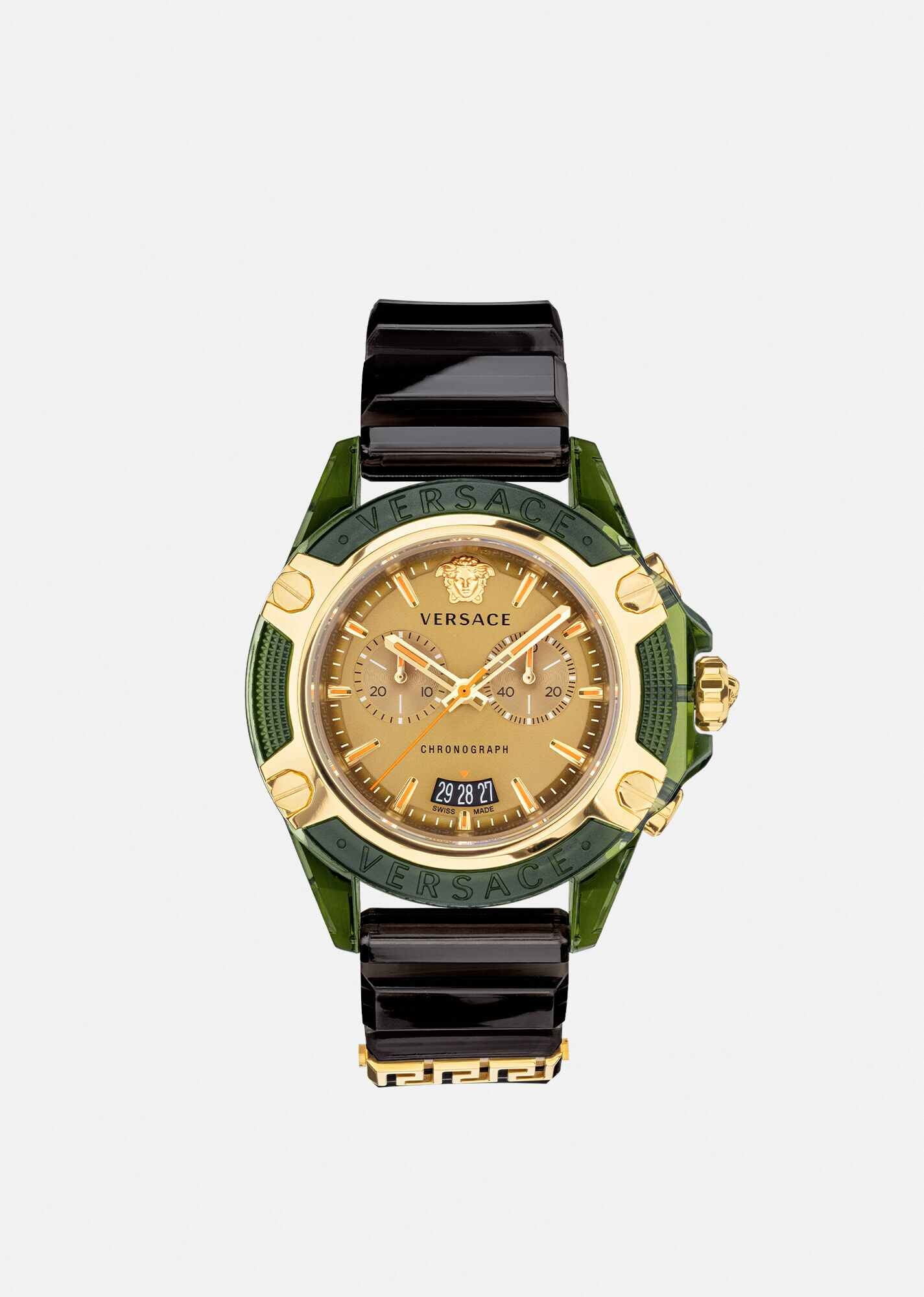 This Icon Active watch features our iconic Medusa and Versace logo at 12 o'clock on a gold-toned face. The transparent military green frame and adjustable band bring a unique and contemporary finish to this piece. DETAILS & CARE - Case: Transparent round case in military green and Versace logo - Dial: Gold dial with Medusa head, Versace logo at 12h - Bracelet: Transparent black strap with metal loop with Greca at 6h and tongue buckle - Movement: RONDA 5021.D Swiss Chrono quartz 2 counters movement with date at 6h - Water resistant: 5 ATM SIZE & FIT - Case: 44 mm