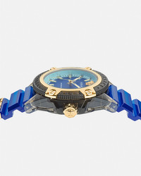 DETAILS The Icon Active watch is a modern and sporty timepiece with transparent elements. Featuring the Medusa and Versace logo at 12 o'clock, a Greca loop accents the metal band. This Indiglo edition features a 3-hands movement and illuminates in the dark. - Case: Transparent polycarbonate round case in IP Black; IP Champagne cage with 4 screws on the top ring - Dial: Blue dial with Medusa; Versace logo at 12h - Bracelet: Transparent Blue PU strap with Greca metal loop at 6h and tongue buckle - Movement: RONDA Vertime 905 Indiglo; Swiss 3-hands quartz movement - Water Resistant: 3 ATM Item: PVE6E003-P0023_RTU_TU_PNUL__ SIZE & FIT - Case size: 1'7" in