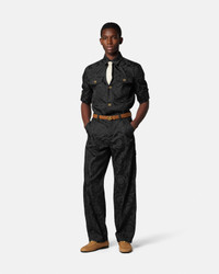 These carpenter pants are crafted in a tonal jacquard cotton-blend featuring an accent enamel Medusa button and Medusa Biggie hardware on the side cargo pocket. - Medusa hardware - Medusa Biggie hardware - Versace Logo leather patch - Belt loops - Front button and zipper closure - Five-pocket design - Cargo pockets - Outer composition: 76% Polyester, 24% Cotton - Lining: 100% Cotton - Trim: 100% Calf leather Size & Fit - The model is 6'1" / 1.86 m tall and wears size 48 IT Item: 1020703-1A16801_1B000