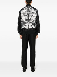 baroque-print bomber jacket Celebrating the essence of the Versace label, this bomber jacket is decorated with a baroque pattern at the back – inspired by the brand's signature Barocco motif, it appears here in black and white with the logo printed in the middle. The design is finished with the classic baseball collar and a zip-fastening pocket at the sleeve. Highlights - Black/white - Satin finish - Baroque-pattern print - Logo print to the rear - Ribbed trim - Baseball collar - Front zip fastening - Branded zip puller - Drop shoulder - Long sleeves - Sleeve zip pocket - Two side flap pockets - Straight hem Imported Composition Outer: Polyester 100% Lining: Polyester 100% SIZE & FIT Model measurements Height 6 ft 1 in(1.86 m) Bust/Chest 37.4 in(95 cm) Hips 36.22 in(92 cm) Waist 29.52 in(75 cm) FittingInformation Designed for a relaxed fit, this piece allows for comfort and movement when worn The ribbed hem offers a close, comfortable fit Made from a midweight non-stretch fabric This piece fits true to size – take your usual size Washing instructions Machine Wash