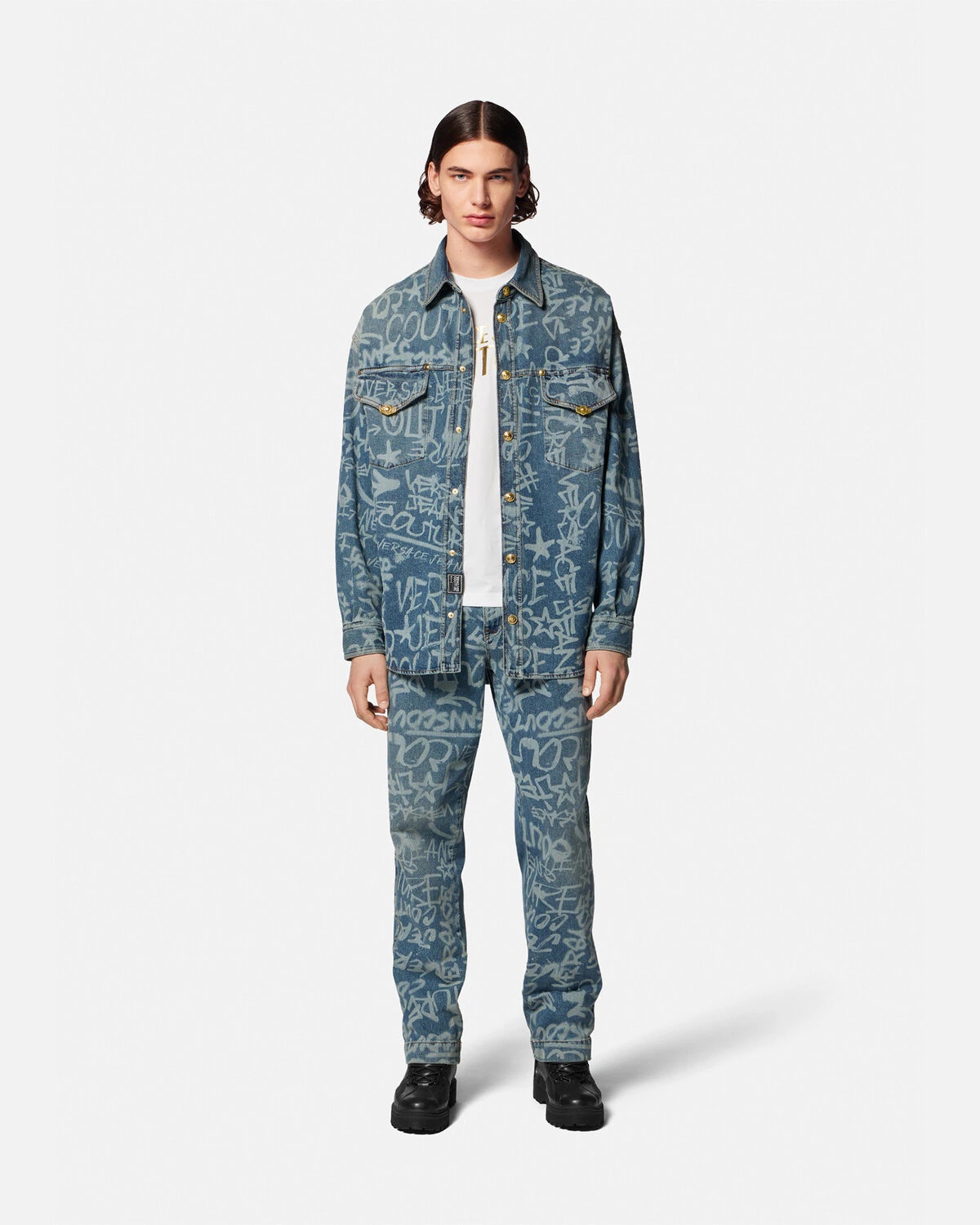 DETAILS A laser-printed light-wash denim jacket featuring an all-over Graffiti motif and accent V-Emblem hardware. - Graffiti print - V-Emblem hardware - Long sleeves - Pointed collar - Front snap-button closure - Flap chest pockets - Outer composition: 98% Cotton, 2% Elastane - Lining: 65% Polyester, 35% Cotton Item: E75GAS454-EDW009L17_E904 SIZE & FIT - The model is 1,89 m tall and wears size 48 - All sizes fit Italian standards