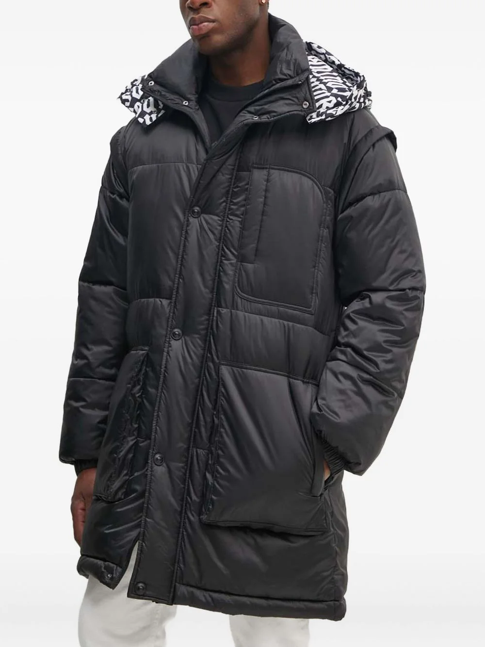 hooded padded coat Highlights - Black - Padded design - Hooded - Front button fastening - Front welt pockets - Long sleeves Imported Composition Polyester 100% Washing instructions Read Manufacturer Guidelines