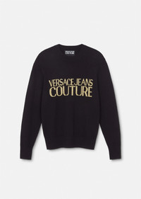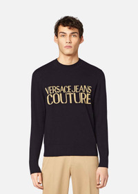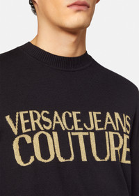 A cotton and cashmere blend sweater with the Versace Jeans Couture logo to the front. DETAILS & CARE - Logo detail - Crew neck - Long sleeves - Ribbed hems - Outside 1: 89% Cotton, 5% Cashmere, 2% Nylon, 2% Viscose, 1% Elastane, 1% Metallised Polyester - Outside 2: 58% Nylon, 42% Metallised Polyester - Hand wash gently using mild detergent - Do not bleach - Do not tumble dry - Drip flat drying in the shade - Cool iron with damp cloth on top - Delicate dry clean - Do not wring or twist SIZE & FIT - All sizes fit Italian standards