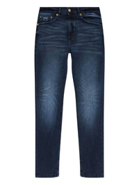 logo-patch jeans Highlights - Navy blue - Logo patch - Gold-tone hardware - Five pockets - Belt loops - Back pockets Imported Composition Cotton 100% Washing instructions Read Manufacturer Guidelines