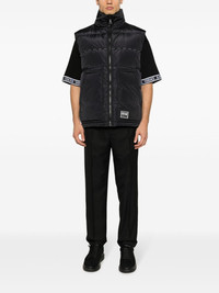logo-print reversible padded gilet A true representation of Versace's strong graphic identity, this padded gilet boasts the logo printed all over in contrasting white for an impactful first look. For more discreet days, the padded construction is reversible and includes an all-black side with a subtle logo patch. Highlights - Black/white - Down-feather filling - Reversible - All-over logo print - Logo patch to the front - Funnel neck - Sleeveless - Front zip fastening - Branded zip puller - Two side slit pockets - Straight hem Imported Composition Lining: Feather Down 100%, Polyester 100% Outer: Polyester 100% SIZE & FIT Model measurements Height 6 ft 1 in(1.86 m) Bust/Chest 37.4 in(95 cm) Hips 36.22 in(92 cm) Waist 29.52 in(75 cm) FittingInformation Designed to be unstructured, offering a loose fit throughout The internal drawstring at the hem allows for fitted preferences Made from a padded non-stretch fabric, giving it no natural elasticity This piece fits true to size – take your usual size