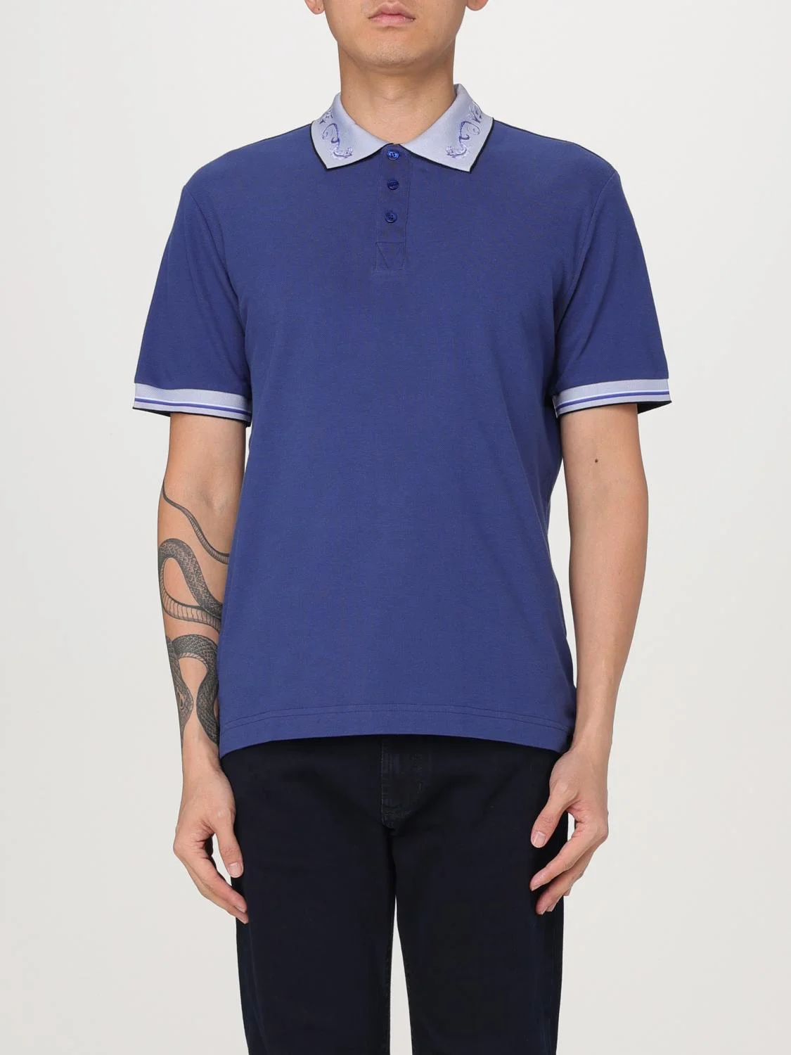 DESCRIPTION - Model: Polo - Neck: Classic - Shoulders: Regular - Sleeves: Short - Closure: With 3-button placket - Bottom: With straight hemline - Materials: Piquet cotton - Pattern: Baroque Versace DETAILS AND CARE Composition TESSUTO 1: 100% CO TESSUTO 2: 51%CO 46%PL 3%E SIZE AND FIT Sizes not available Size and fit Regular fit Designer code: 77GAGT06CJ01T 238 Giglio Code: G18385 Designer: Versace Jeans Couture Collection: Versace Jeans Couture Men Category: Clothing Versace Jeans Couture