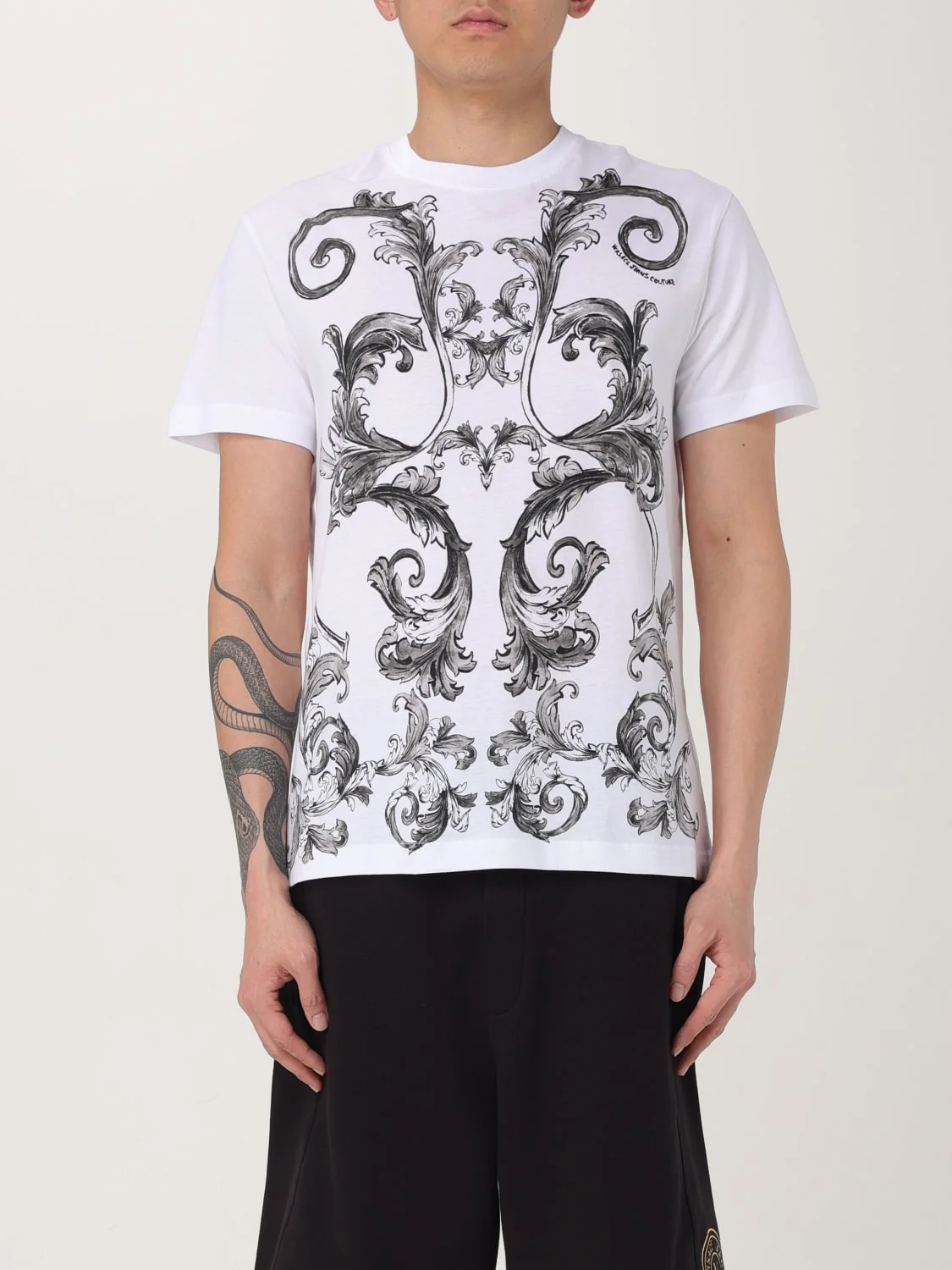 DESCRIPTION - Style: Sporty - Model: Crewneck - Neckline: Crewneck - Shoulders: Regular - Sleeves: Short - Bottom: With straight hemline - Materials: Cotton - Pattern: Baroque DETAILS AND CARE Composition cotton 100% SIZE AND FIT Sizes not available Size and fit Slim fit Designer code: 78GAH6SBJS461 003 Giglio Code: G60052 Designer: Versace Jeans Couture Collection: Versace Jeans Couture Men Category: Clothing Versace Jeans Couture