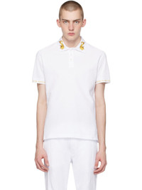 Cotton piqué polo. · Rib knit spread collar and cuffs · Logo graphic printed at collar · Three-button placket · Vented side seams · Logo printed at cuffs Supplier color: White/Gold