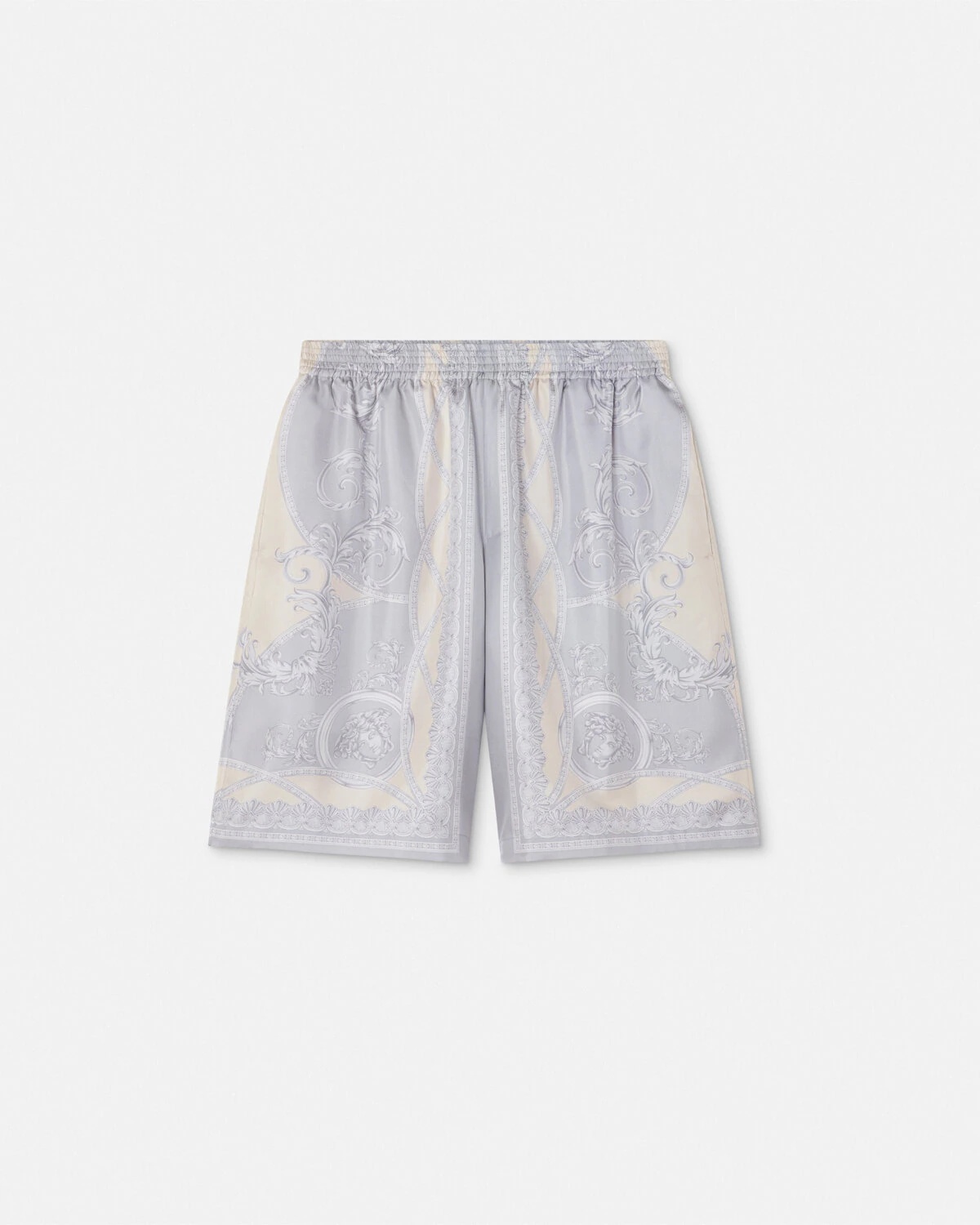 DETAILS Kneelength shorts crafted from pure silk twill featuring La Coupe des Dieux print - La Coupe des Dieux print - Side pockets - Back welt pockets - Elastic waistband - Outer composition: 100% Silk - Lining: 100% Cupro Item: 1002476-1A11391_5E450 SIZE & FIT - The model is 6'1" / 1.87 m tall and wears size 48 IT