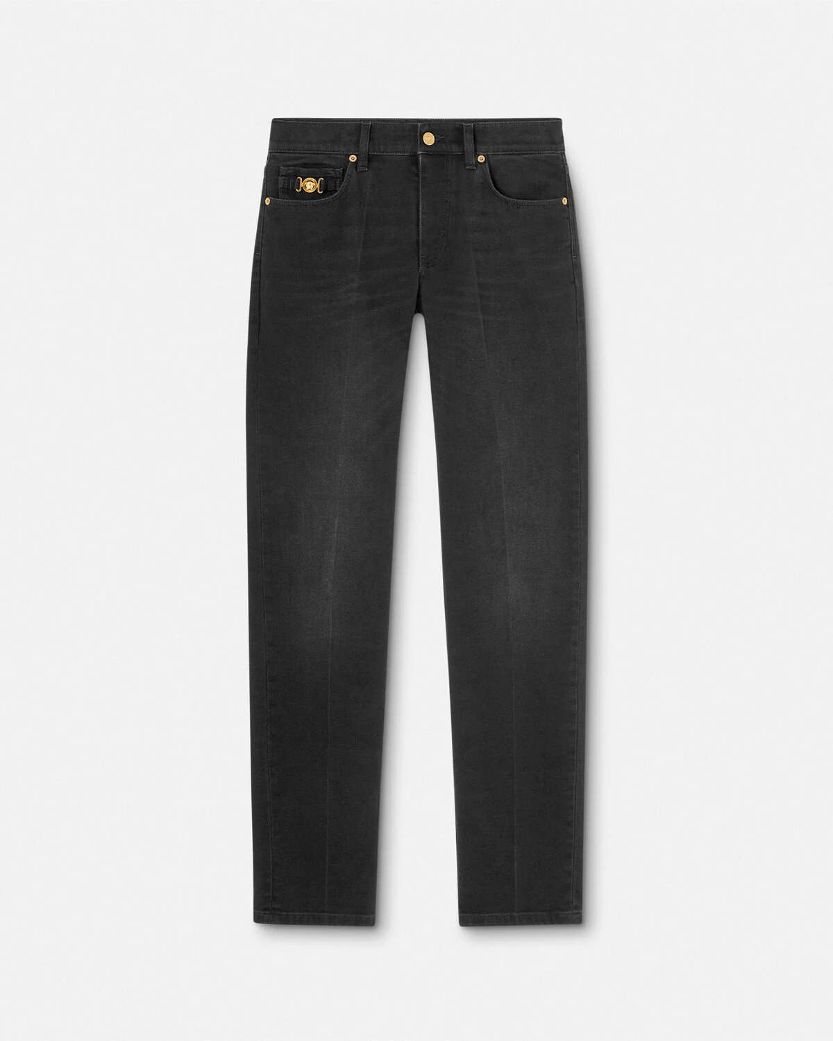 DETAILS These tailored slim-fit jeans are made from cotton denim and detailed with Medusa Biggie hardware at the pocket and an enamel Medusa button. - Medusa Biggie hardware - Medusa hardware - Belt loops - Front button and zip closure - Five-pocket design - Back leather logo patch - Outer composition: 99% Cotton, 1% Elastane - Lining: 65% Polyester, 35% Cotton - Trim: 100% Calf leather Item: 1011693-1A09955_1D510 SIZE & FIT - The model is 6'2" tall and wears size 32 IT