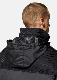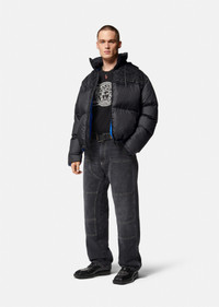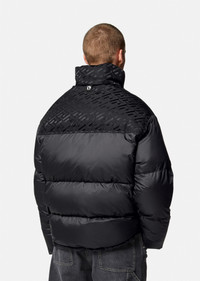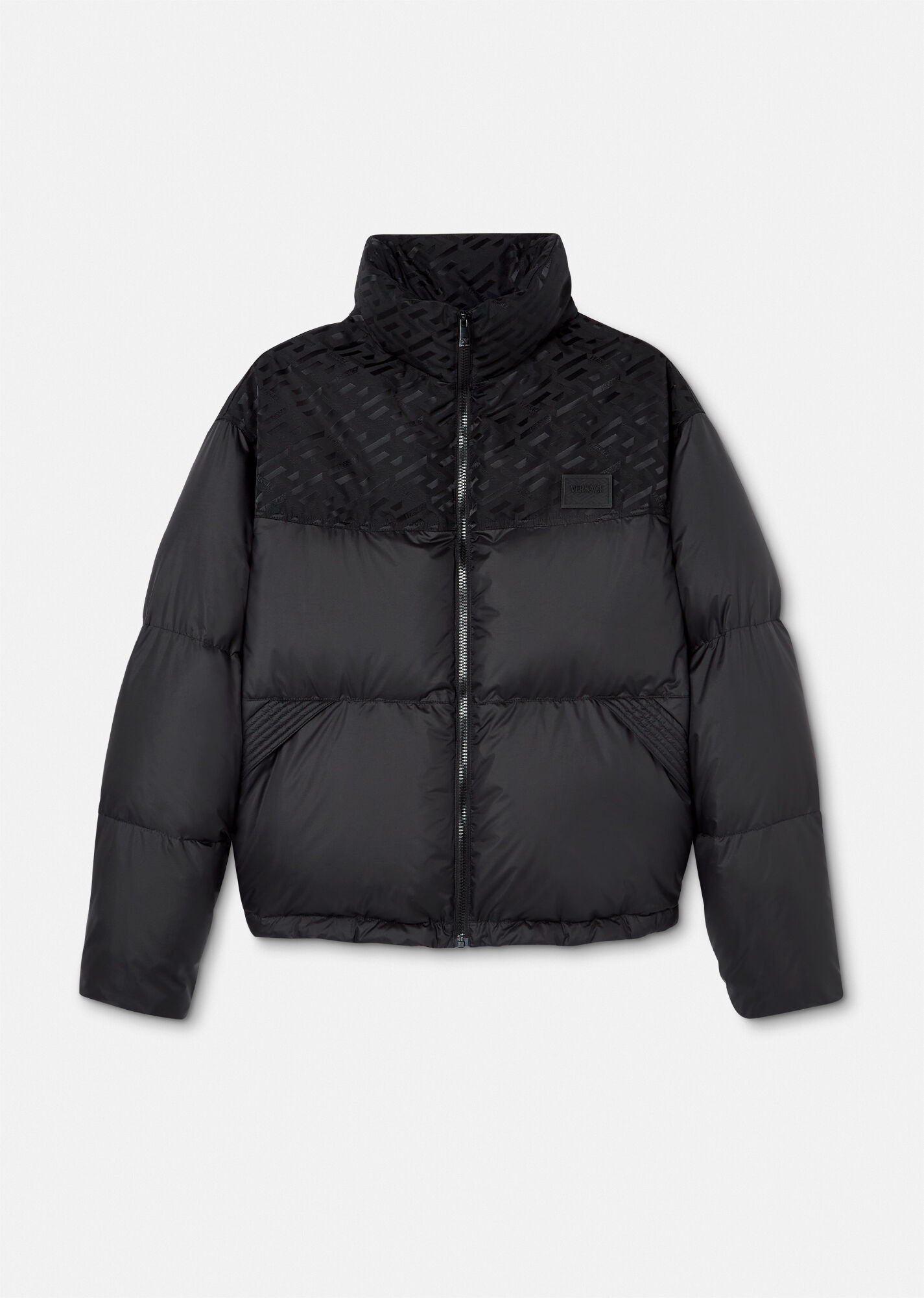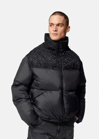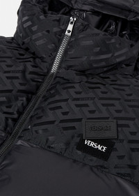 A padded style, this puffer jacket features a panelled design with a tonal La Greca print. The high-neck style is detailed with a lightweight tuckaway hood and has a removable logo patch at the chest. DETAILS & CARE - La Greca print lining - Long sleeves - High-neck - Tuckaway hood - Side pockets - Internal zip pockets - Elasticated drawstring hem - Outer composition 1: 100% Nylon - Outer composition 2: 100% Nylon - Lining 1: 100% Polyester - Lining 2: 100% Polyester - Lining 3: 100% Nylon - Lining 4: 100% Cotton - Padding: 90% Down, 10% Goose down SIZE & FIT - All sizes fit Italian standards