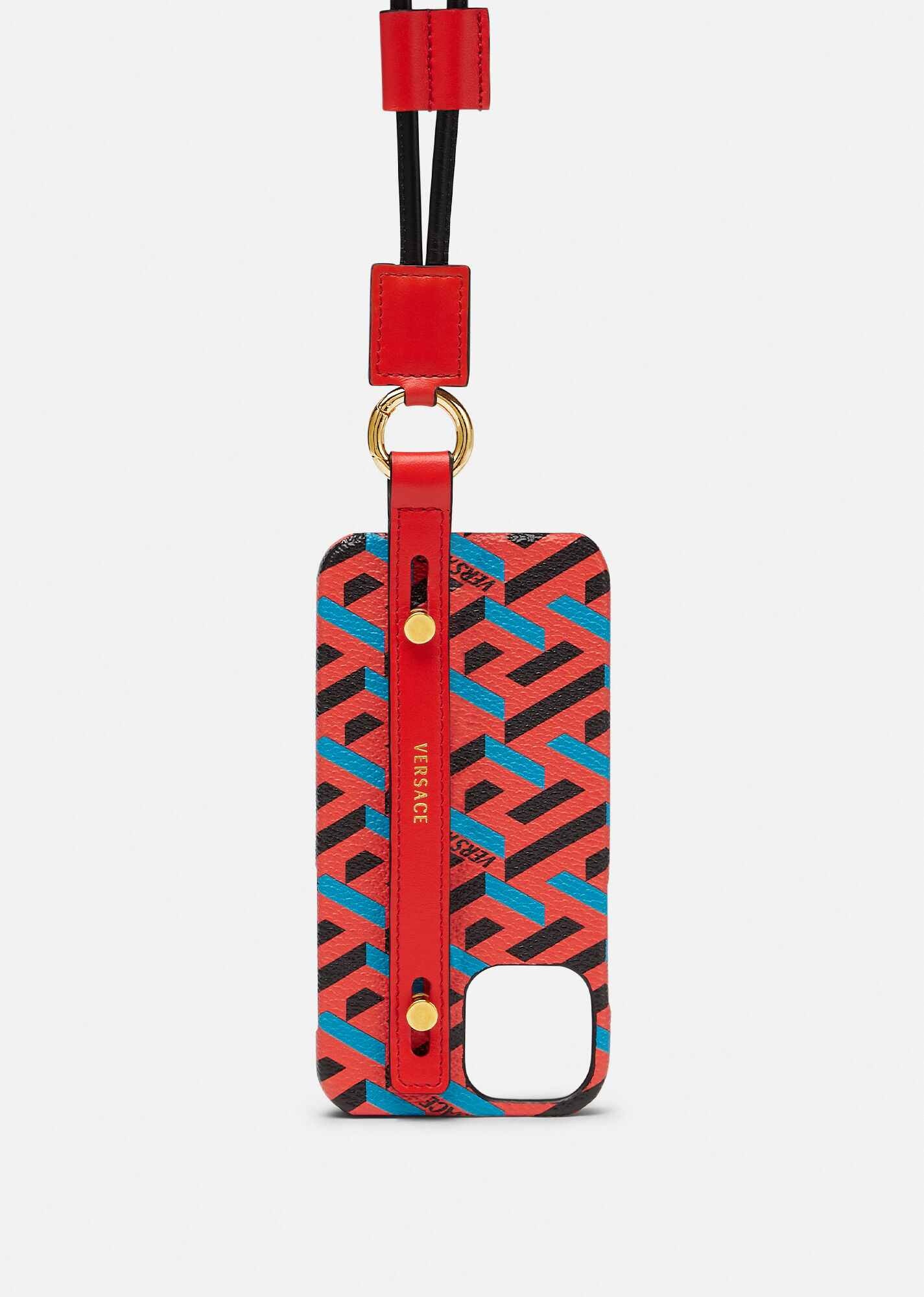 A contemporary accessory, this phone case is crafted from coated La Greca canvas. The design features a detachable leather strap that allows for styling around the neck. DETAILS & CARE - La Greca coated canvas - Detachable leather strap - Compatible with iPhone 12 - Outer fabric: 100% Polyurethane - Trim 1: 100% Calf leather - Trim 2: 70% Polycarbonate 30% TPU SIZE & FIT - Length: 7,5 cm - Width: 12 cm - Height: 1,5 cm - Compatible with iPhone 12