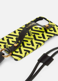 A contemporary accessory, this phone case is crafted from coated La Greca canvas. The design features a detachable leather strap that allows for styling around the neck. DETAILS & CARE - La Greca coated canvas - Detachable leather strap - Compatible with iPhone 12 - Outer fabric: 100% Polyurethane - Trim 1: 100% Calf leather - Trim 2: 70% Polycarbonate 30% TPU SIZE & FIT - Length: 7,5 cm - Width: 12 cm - Height: 1,5 cm - Compatible with iPhone 12