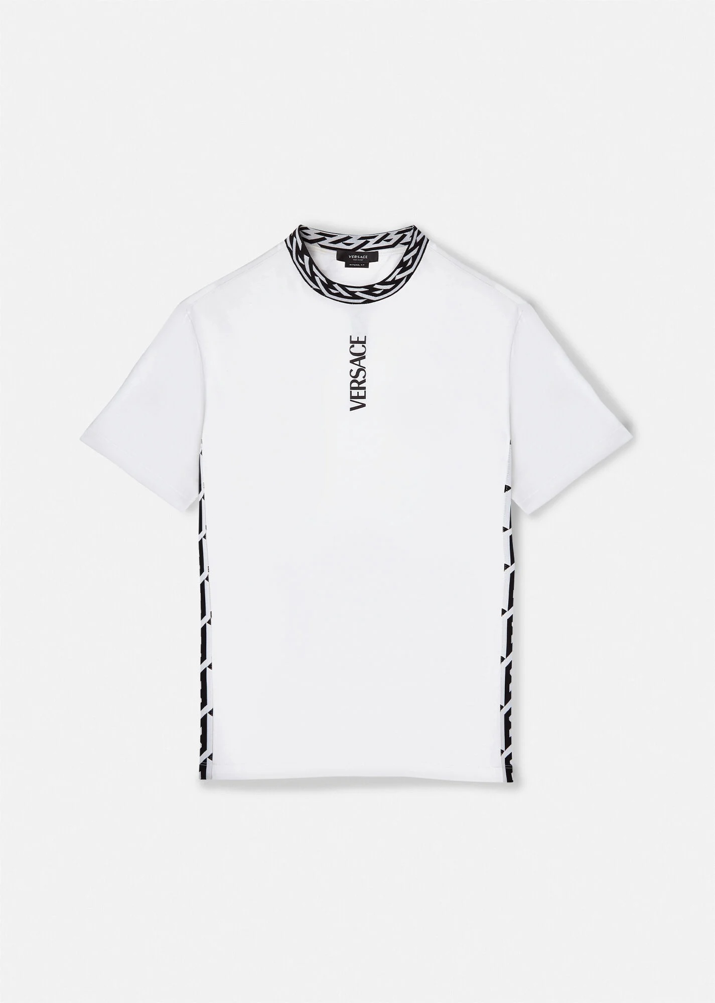Instantly recognizable, this cotton t-shirt features a La Greca pattern on the collar. The slim fit style is finished with a central Versace logo. DETAILS & CARE - La Greca - Logo - Outer fabric: 100% Cotton - Trim: 100% Polyamide - Cool iron - Delicate dry clean - Do not bleach - Do not tumble dry - Machine wash cold (delicate) SIZE & FIT - All sizes fit Italian standards