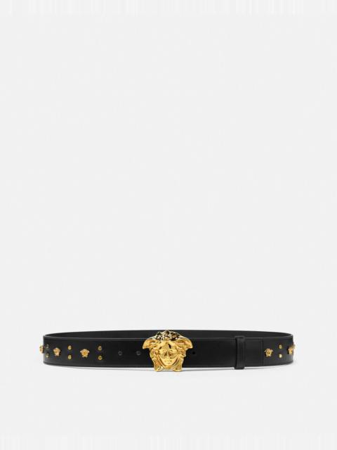DETAILS Crafted in Italy from supple leather, this belt is embellished with a Medusa buckle. - Medusa buckle - Greca embossing - Outside: 100% Calf leather - Lining: 100% Calf leather Item: DCU4140-DVTP1_1B00E SIZE & FIT - Height 1.6" - Buckle height: 2.2"