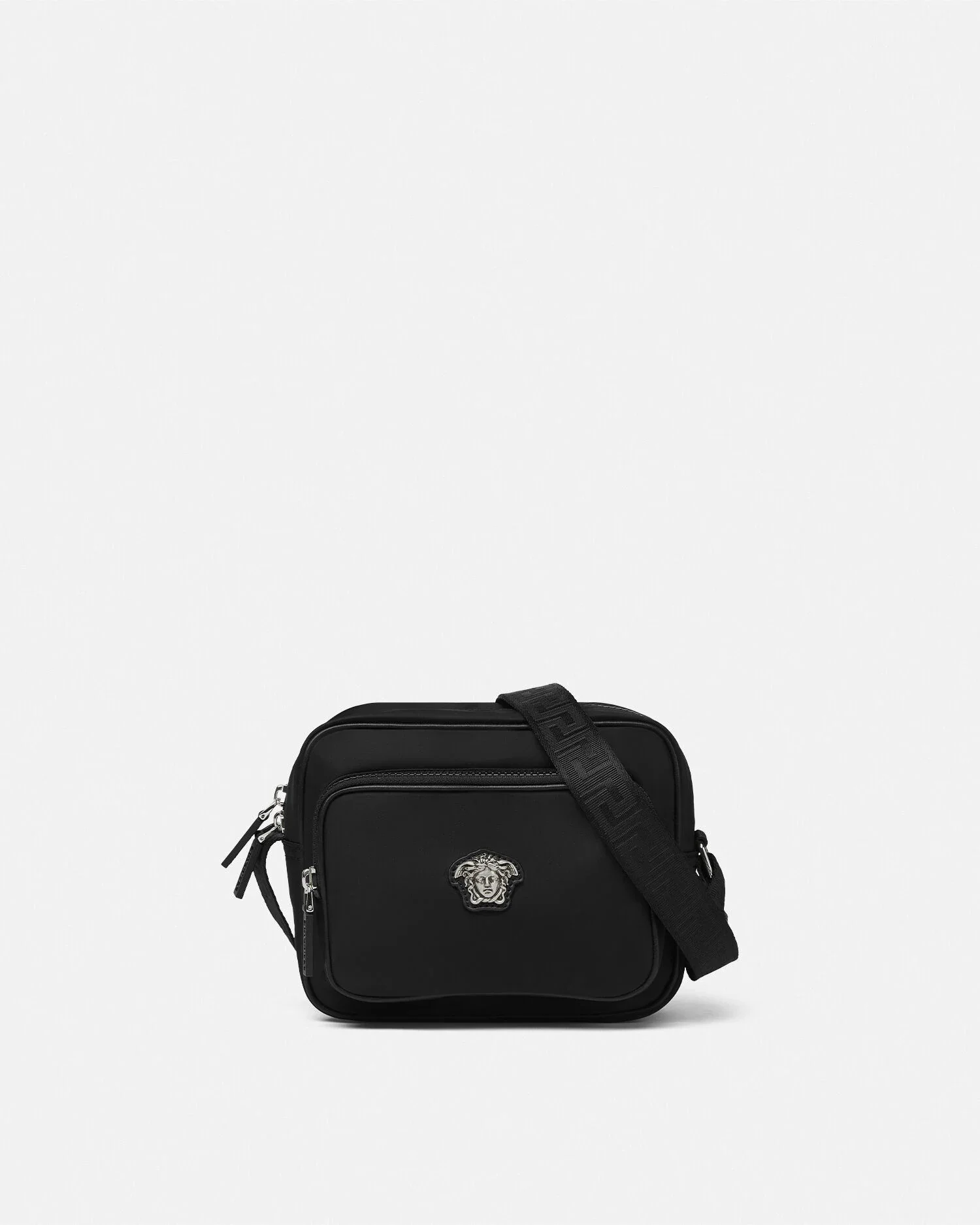 A nylon messenger bag featuring the House's iconic La Medusa hardware and an adjustable jacquard Greca strap. The spacious accessory is detailed with a front zipped pocket and a V-ring hardware, perfect for personalizing with Versace keychains and charms. - La Medusa hardware - Greca motif - V-ring hardware - Top two-way zip closure - Front zipped pocket - Adjustable shoulder strap - Outer composition: 100% Nylon - Lining: 100% Nylon - Trim: 100% Nylon Size & Fit - L8.3 x W5.1 x H6.7" / L21 x W13 x H17 cm - Shoulder strap drop: L11.8-23.6" / L30-60 cm Item: 1020229-1A14493_DTU_UNICA_1B00P__