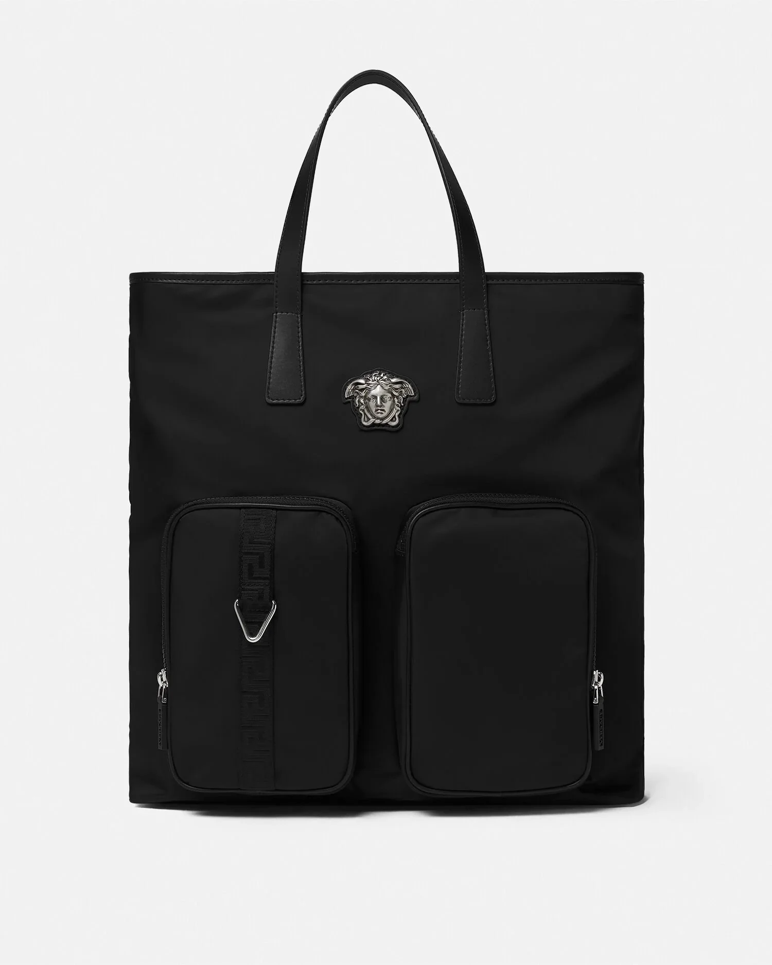 A nylon tote bag featuring the House's iconic La Medusa hardware and an adjustable jacquard Greca shoulder strap. The top handle design has an interior zipped pocket and a top zip closure. It's detailed with V-ring hardware, perfect for personalizing with Versace keychains and charms. - La Medusa hardware - Greca motif - V-ring hardware - Top handles - Top zip closure - Front zipped pockets - Interior slip pocket - Adjustable shoulder strap - Outer composition: 100% Nylon - Lining: 100% Nylon - Trim: 100% Nylon Size & Fit - L38 x W16 x H40 cm - Shoulder strap drop: L35-67 cm Item: 1020228-1A14493_DTU_UNICA_1B00P__