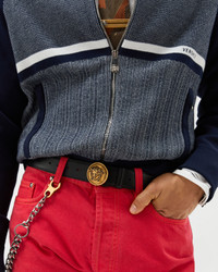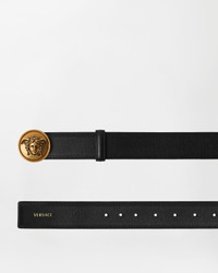 A calf leather belt with a Versace Logo lettering featuring a round metal buckle in a vintage finish, featuring 3D Medusa hardware. - Medusa hardware - Versace logo lettering - Belt loop - Press closure - Outer composition: 100% Calf leather - Lining: 100% Calf leather Size & Fit - Height: 1.4" / 3.5 cm Item: 1024410-DVTP1_1B55J