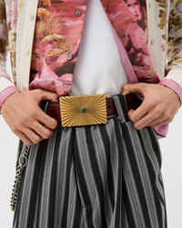 A calf leather belt with a small Versace Logo lettering featuring an antique-inspired rectangular buckle with an engraved sunray motif and a central colored glass stone. - Versace logo lettering - Belt loop - Press closure - Outer composition: 100% Calf leather - Lining: 100% Calf leather Size & Fit - Height: 1.6" / 4 cm Item: 1024407-1A17848_2NM2J