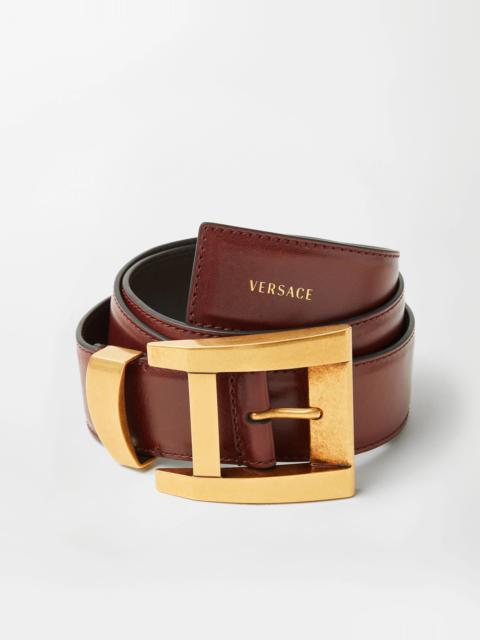 A calf leather belt with a small Versace Logo lettering featuring a metal buckle and belt loop. - Versace logo lettering - Belt loop - Pin buckle closure - Outer composition: 100% Calf leather - Lining: 100% Calf leather Size & Fit - Height: 1.6" / 4 cm Item: 1024197-1A17848_1B55J