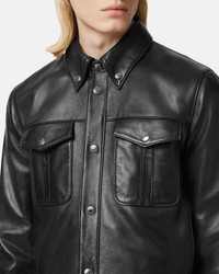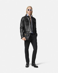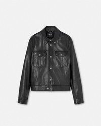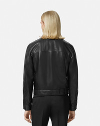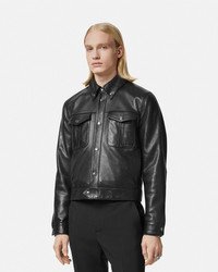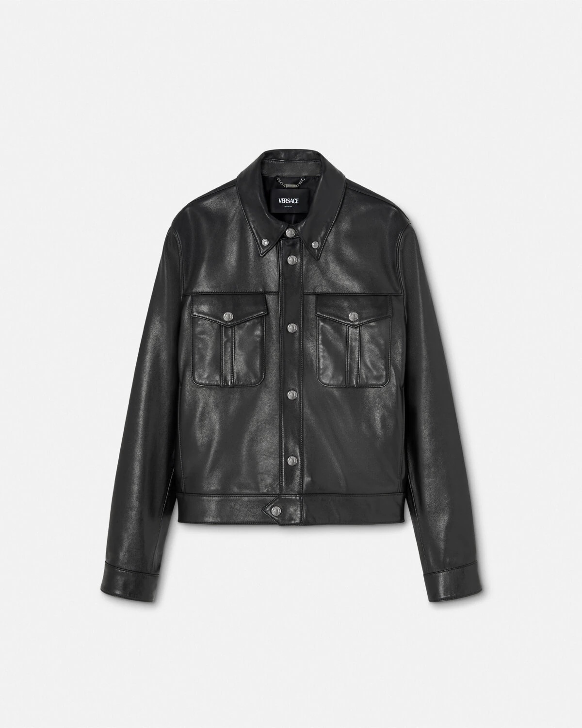 DETAILS A smooth nappa plongè leather blouson jacket with a snap, button-down collar and a tonal embossed Versace logo patch at the back. - Medusa hardware - Versace logo leather patch - Long sleeves - Pointed collar - Front snap-button closure - Snap-buttoned cuffs - Outer composition: 100% Lambskin - Lining 1: 100% Cupro - Lining 2: 100% Cotton - Trim: 100% Lambskin Item: 1015729-1A00713_1B000 SIZE & FIT - The model is 6'1" / 1.87 m tall and wears size 48 IT