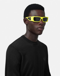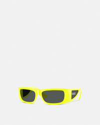 DETAILS A dynamic, soft-rectangular shape, these injected sunglasses are detailed with lens inserts at the wide temples featuring silver-tone metal Versace logo lettering. - Versace Logo motif - Frame color: Yellow fluo - Temple color: Yellow fluo - Lens color: Dark gray - Frame: Injected - Temple: Injected Item: O4482-O54498757_RTU_TU_ONUL__ SIZE & FIT - Lens: W2.2 x H1.4" / W57 x H35.2 mm - Bridge: 0.62" / 16 mm - Temple: 5.3" / 135 mm