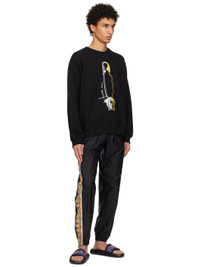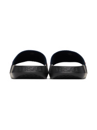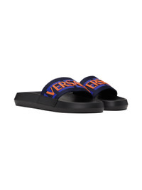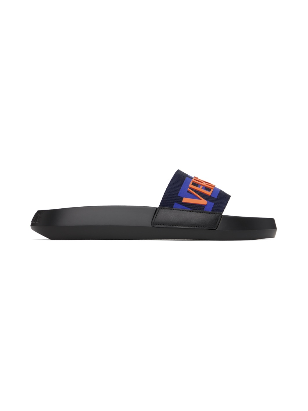 Webbing slip-on sandals in navy. Signature Greek key pattern printed in blue at vamp. · Open round toe · Logo bonded in orange at vamp · Logo embossed at heel · Buffed calfskin trim at sides · Molded rubber footbed · Treaded rubber sole Supplier color: Navy/Cobalt