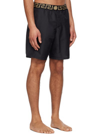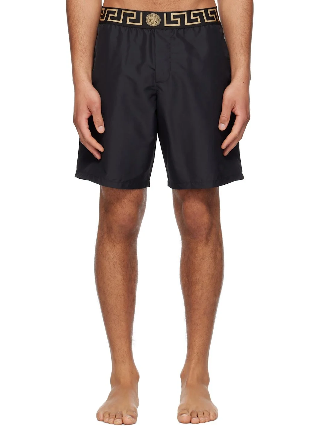 Tapered straight-leg polyester faille swim shorts. · Jacquard Greca pattern at elasticized waistband · Two-pocket styling · Mock fly · Integrated brief-style jersey lining Supplier color: Black Body: 100% polyester. Trim: 82% polyester, 9% polyamide, 9% elastane. Lining: 94% polyamide, 6% elastane. Made in Italy 251653M208006