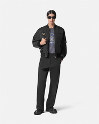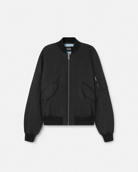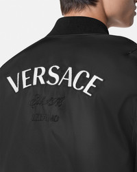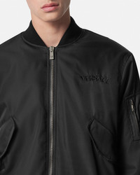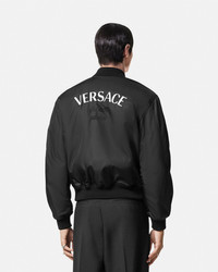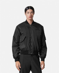 DETAILS A padded nylon bomber jacket featuring a tonal embroidered Versace logo at the chest, detailed with ribbed trims. - Versace logo embroidery - Long sleeves - Front zip closure - Front flap pockets - Ribbed collar, hem, and cuffs - Outer composition: 100% Nylon - Lining 1: 100% Polyester - Lining 2: 100% Cotton - Embroidery 1: 70% Viscose, 30% Polyester - Embroidery 2: 46% Acrylic, 30% Polyester, 24% Viscose - Padding: 100% Polyester - Trim: 90% Cotton, 5% Elastane, 5% Nylon Item: 1013929-1A09848_1B000 SIZE & FIT - The model is 5'8" tall and wears size 38 IT
