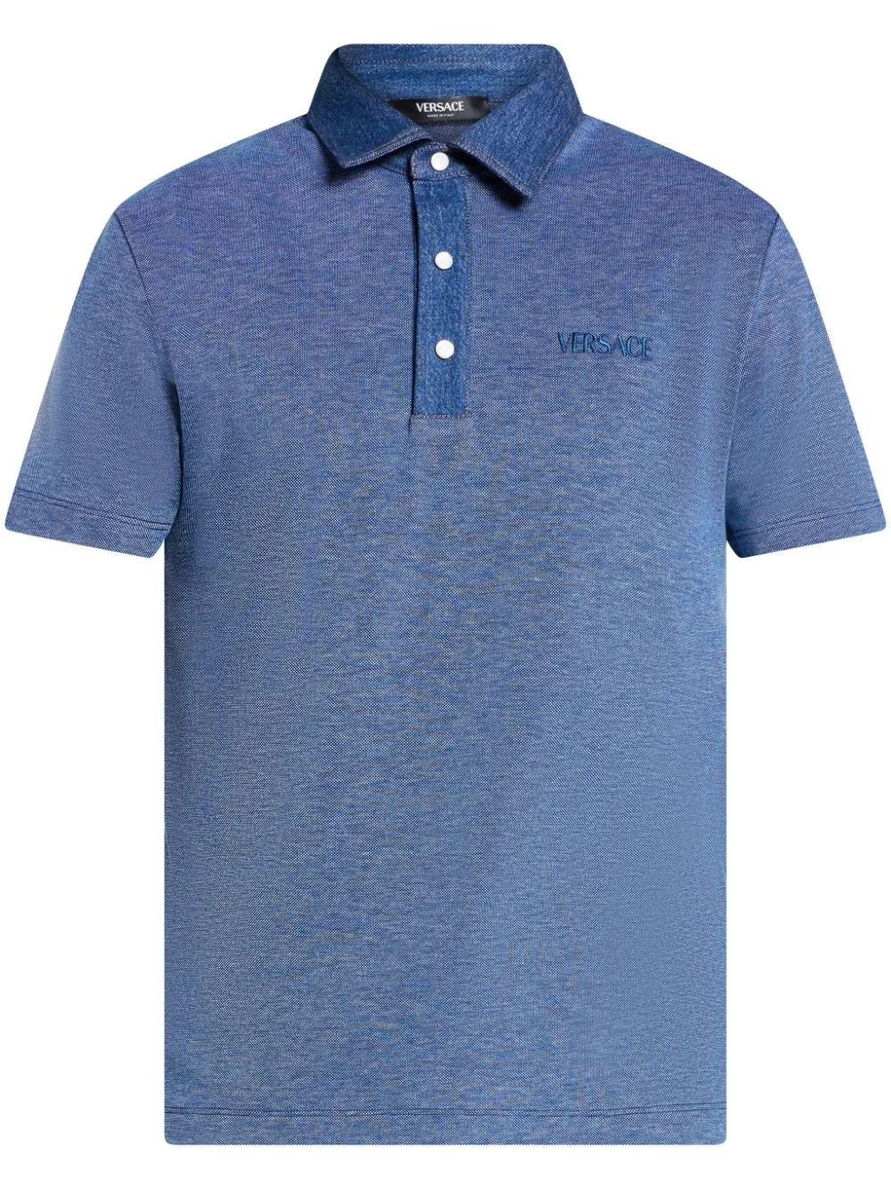 logo-embroidered cotton polo shirt Versace offers a classic style with this polo shirt. It’s crafted from blue cotton pique and adorned with the brand's logo with tonal threads at the chest Highlights - Blue - Cotton - Pique weave - Embroidered logo at the chest - Polo collar - Short sleeves - Front button placket - Straight hem Made in Italy Composition Cotton 100% Washing instructions Read Manufacturer Guidelines