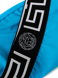 logo-print strap swim trunks Highlights - Aqua blue/black - Stretch-design - Logo-print strap - Medusa head motif - Elasticated waistband - Be mindful to try on swimwear over your own garments. Made in Italy Composition Outer: Polyamide 78%, Elastane 22% Lining: Polyester 88%, Elastane 12% Washing instructions Hand Wash