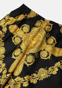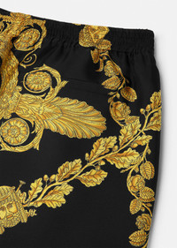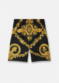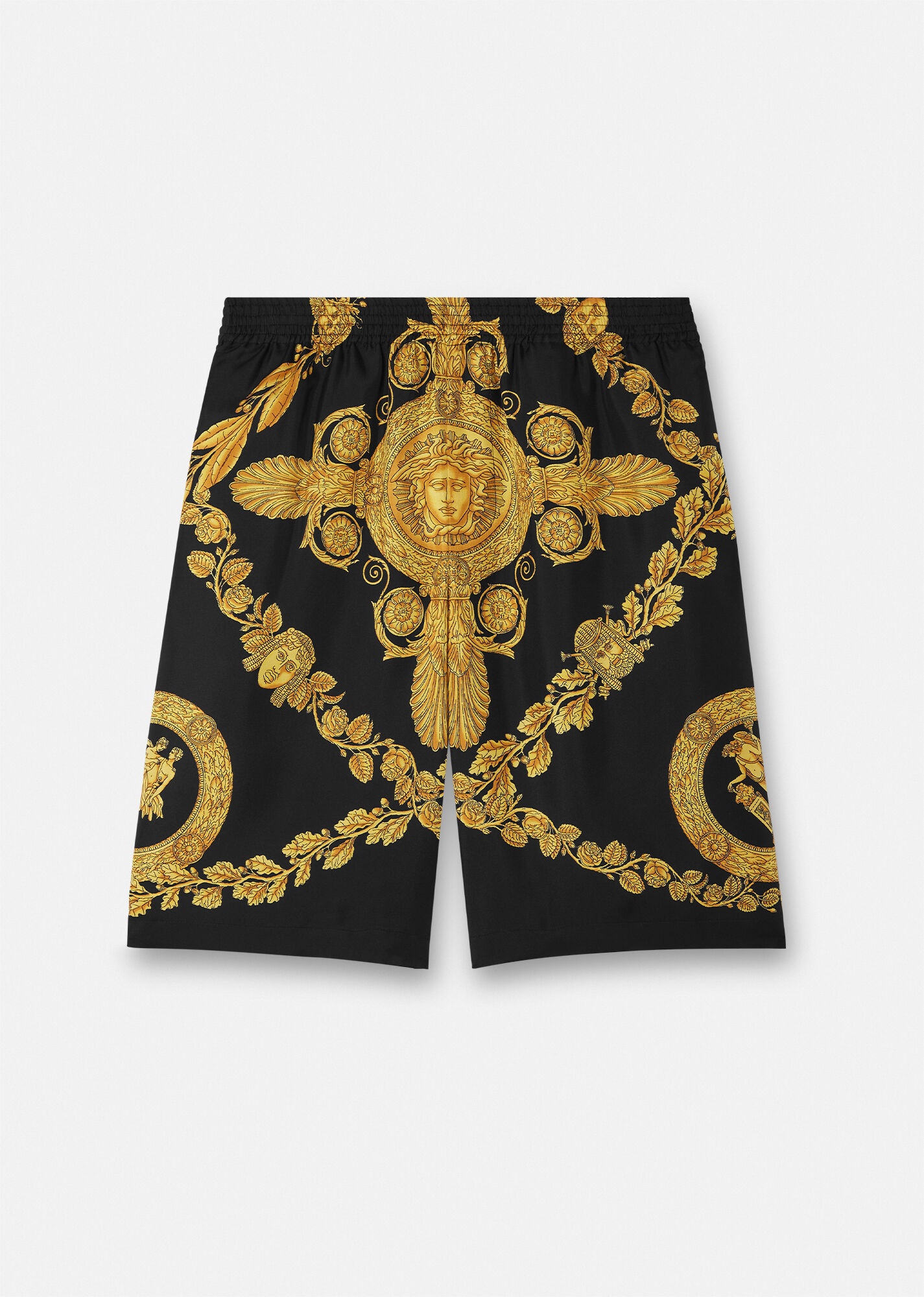 Knee-length silk shorts featuring the Maschera Baroque print—a chain-inspired motif with classical theatre masks and acanthus leaves incorporated within its design. DETAILS & CARE - Maschera Baroque print - Side pockets - Back welt pocket - Outer composition: 100% Silk - Lining: 100% Cupro - Do not wash - Do not bleach - Do not tumble dry - Cool iron - Delicate dry clean SIZE & FIT - All sizes fit Italian standards