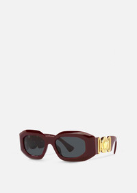 Inspired by '90s hip-hop culture, these sunglasses feature acetate frames and wide Medusa-embellished temples. The rectangular shape is finished with dark tinted lenses. DETAILS & CARE - Frame colour: Bordeaux - Temple colour: Bordeaux - Details: Gold-tone Medusa Biggie hardware - Lens colour: Dark Grey - Lens shape: Irregular - Frame: Injected - Temple: Injected - Made in Italy SIZE & FIT - Eye size: 54 - Bridge: 18 - Temple: 145