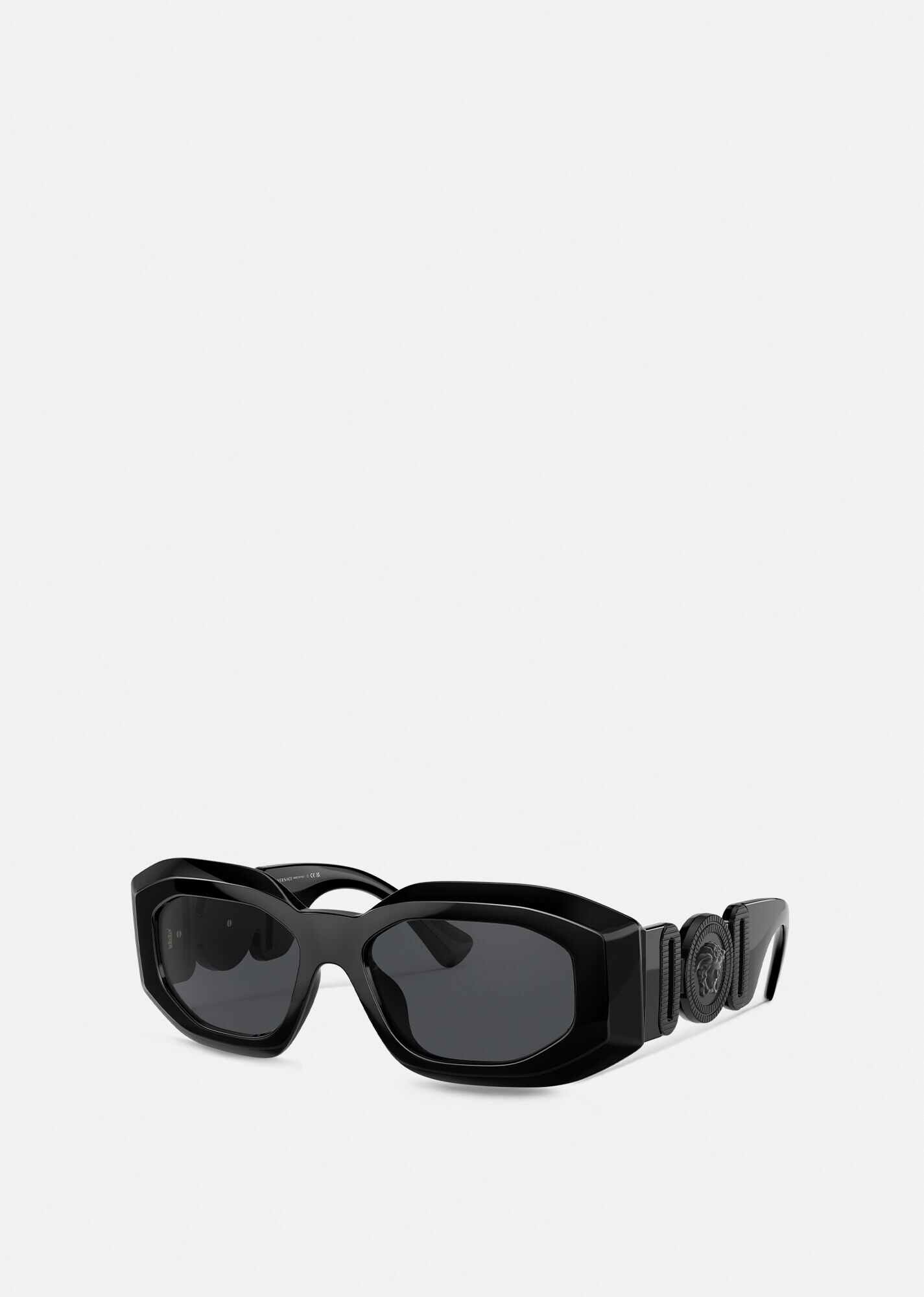 DETAILS Inspired by '90s hip-hop culture, these sunglasses feature acetate frames and wide tonal, Medusa-embellished temples. The rectangular shape is finished with dark tinted lenses. - Frame colour: Black - Temple colour: Black - Lens colour: Dark grey - Made in Italy Item: O4425U-O53608754_RTU_TU_ONUL__ SIZE & FIT - Eye size: 54 - Bridge: 18 - Temple: 145