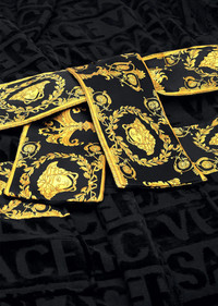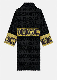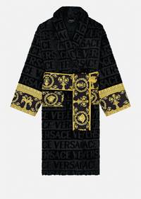 Covered in a faint textural Versace logo print and accented by a Barocco printed sleeve and wrap belt, this soft and iconically covered bathrobe exudes luxury. DETAILS & CARE - Towelling bathrobe - Detachable belt with Barocco print - Pockets on the front - Greca print details on the sleeves - 100% Cotton - Cool iron - Do not bleach - Do not dry clean - Machine wash at 30° C - Wash with a Chlorine free detergent - Tumble dry low SIZE & FIT - All sizes fit Italian standards