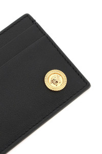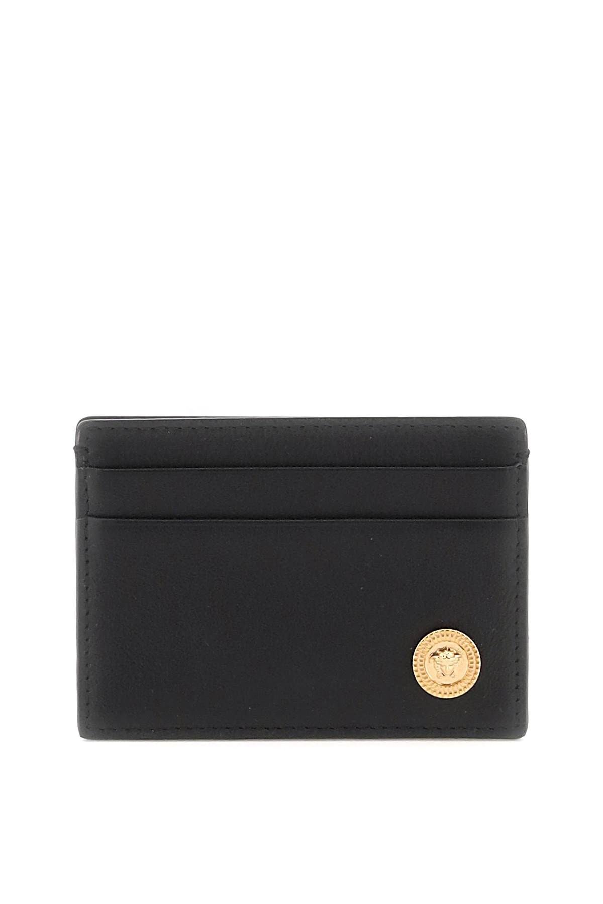 Versace credit card holder made of smooth leather with four slots and a central slit pocket featuring iconic gold-tone metal Medusa.