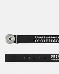 A calf leather belt with stud and crystal embellishments featuring a Medusa Biggie buckle closure and accent belt loop. - Medusa Biggie hardware - Belt loop - Press closure - Outer composition: 100% Calf leather - Lining: 100% Calf leather Size & Fit - Height: 1.6" / 4 cm Item: 1003873-1A16640_1B00P