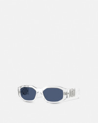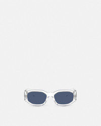 DETAILS Sunglasses that evoke the opulent style of a hip-hop icon with a bold low-lens shape and wide temples embellished by a gold-tone heritage Medusa medallion. In a classic combination of a thick black frame and gray lenses. - Medusa Biggie hardware - Frame color: Crystal - Temple color: Crystal - Lens color: Dark blue - Frame: Nylon - Temple: Nylon Item: O4361-O1488053_RTU_TU_ONUL__ SIZE & FIT - Lens: W2.1 x H1.4" / W53 x H36.2 mm - Bridge: 0.7" / 18 mm - Temple: 5.5" / 140 mm