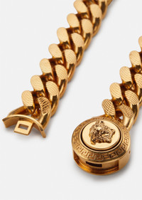 Gold tone metal chain bracelet with a Medusa closing. Features guilloché engraving on the chain. This piece has a vintage effect colour quality. All Versace Jewellery products are lead and nickel free. All the materials are hypoallergenic. DETAILS & CARE - Vintage effect - Guilloché engraved chain Medusa - 100% Metal - Finish: Tribute Gold - Please note that water and perfume can damage the item SIZE & FIT - M 23CM - L 25CM