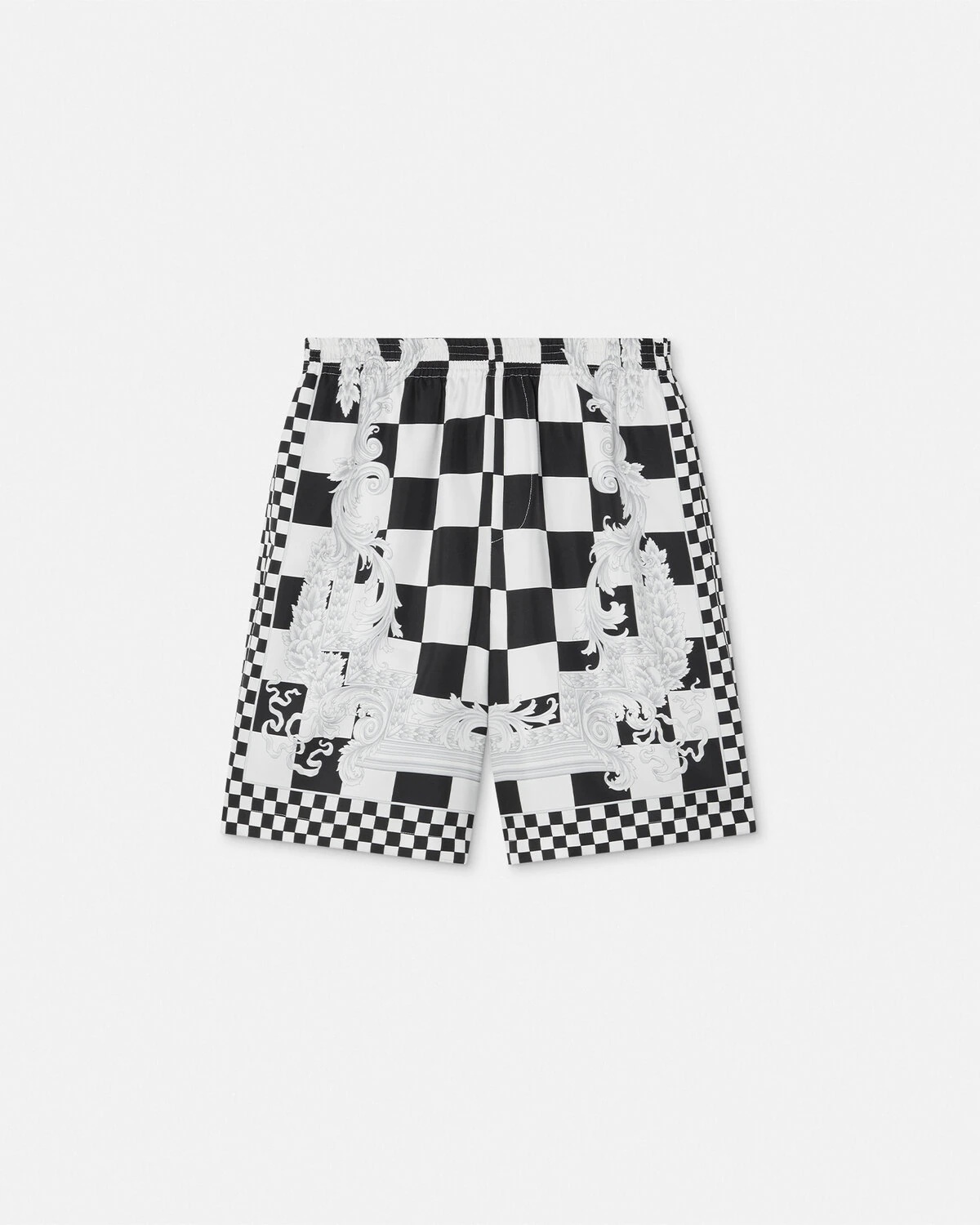 DETAILS Knee-length shorts crafted from pure silk twill featuring a checkerboard Medusa print. - Medusa Contrasto print - Elastic waistband - Side pockets - Back welt pocket - Outer composition: 100% Silk - Lining: 100% Cupro Item: 1002476-1A10864_5X550 SIZE & FIT - The model wears size 48 - All sizes fit Italian standards