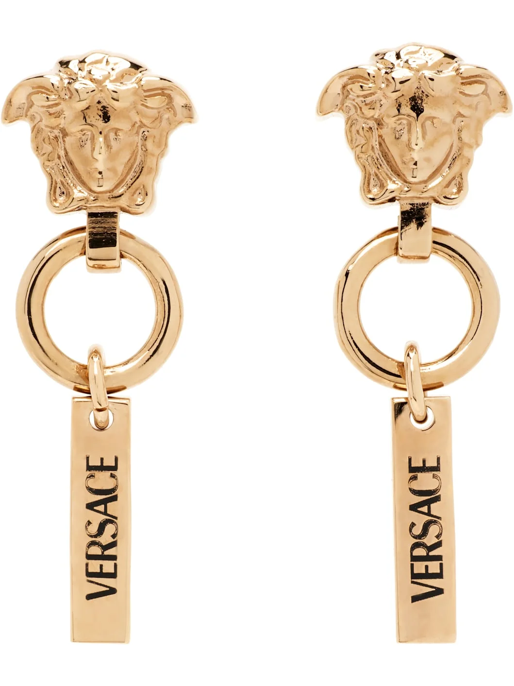 Pair of drop earrings in gold-tone brass. · Signature Medusa at face · Logo-engraved plaque at drop · Post-stud fastening · H1.5" x W0.5" Supplier color: Versace gold Brass. Made in Italy 261404M144006