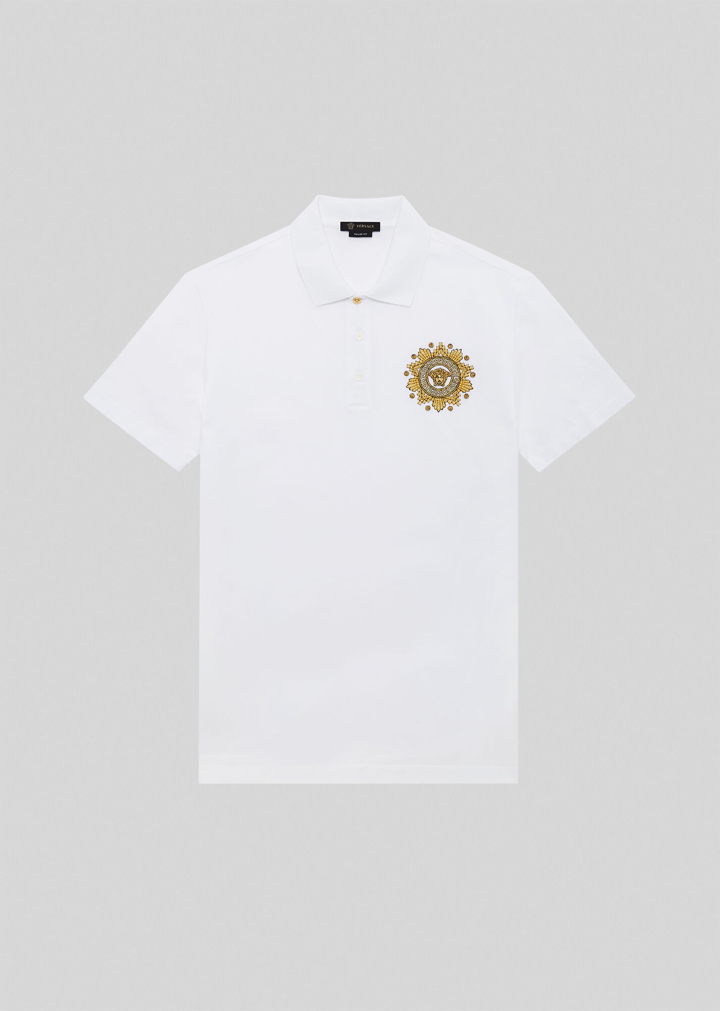 Versace's iconic Medusa motif adorns this polo shirt in the form of gleaming gold embroidery. It's been crafted from cotton piqué and is punctuated by three buttons - one of which depicts the Medusa. DETAILS & CARE - Collar - Button closure - Button with Medusa - Short sleeves - Medusa mebroidery - Outer fabric: 100% Cotton - Embroidery: 70% Viscose, 30% Polyester - Trim: 100% Cotton - Cool iron - Delicate dry clean - Machine wash cold (delicate) - Do not bleach - Do not tumble dry - Made in Italy